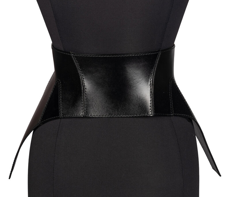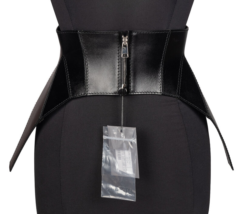 Black Calfskin Articulated Corset-Style Belt with Zipper Closure.