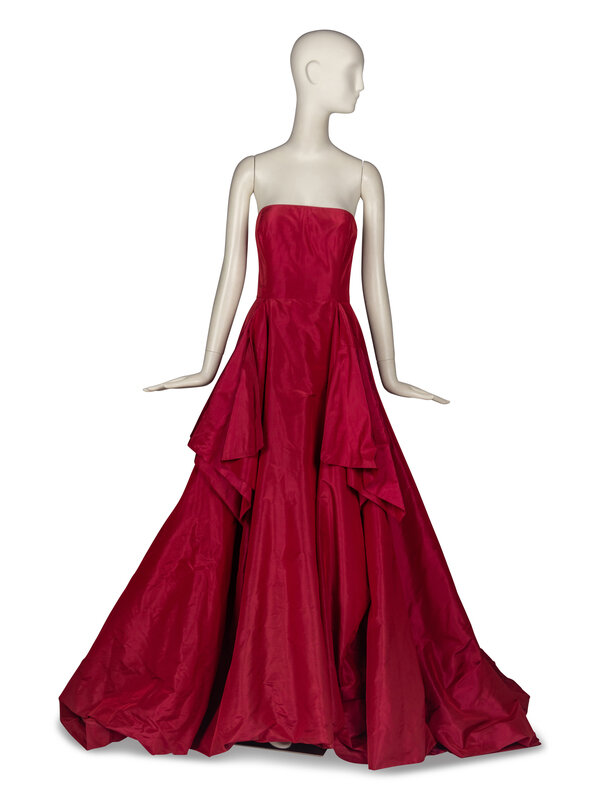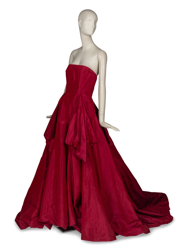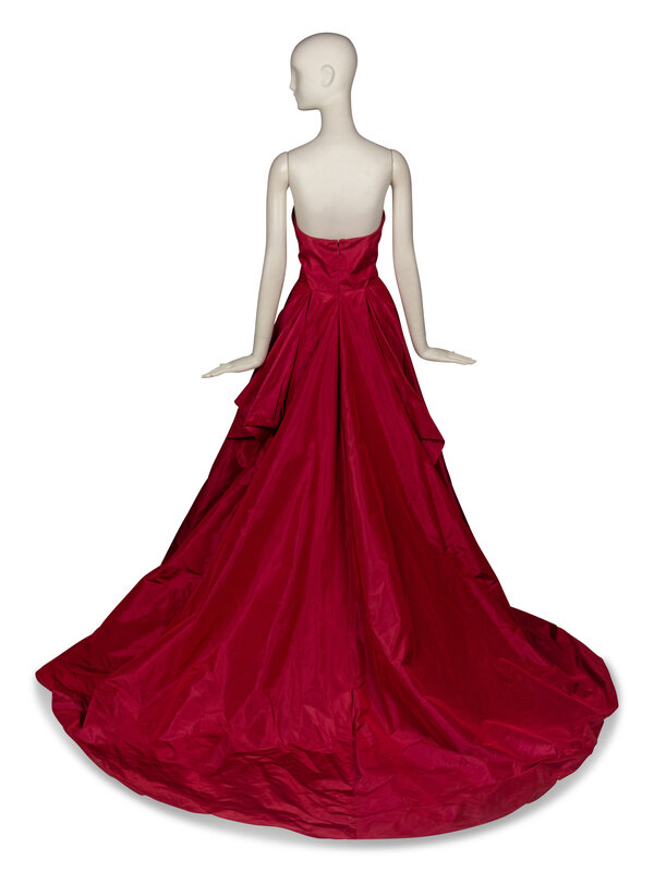 Strapless gown in crimson silk taffeta with raspberry shift. At interior: stretch mesh corselette with boning, built-in bra cups, zipper closure to corselette, waistband with hook-and-bar closure. Invisible zipper closure at exterior back. Fully lined with crinoline.