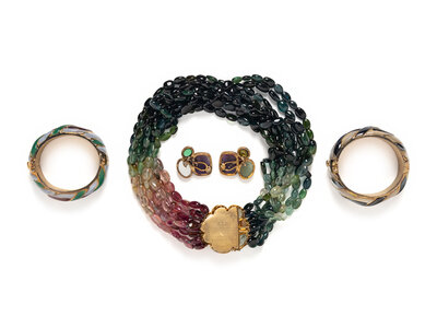 KYLO hinged bangle, stamped 925. Organic pattern comprised of inset white, green, and purple stones.