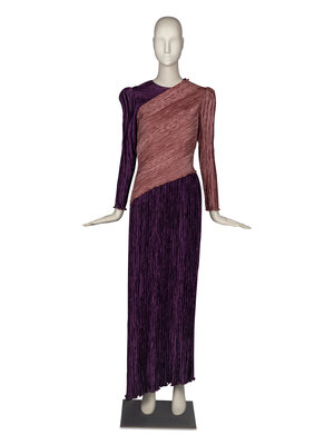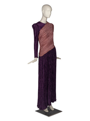 Long-sleeve purple and pink gown in pleated synthetic charmeuse. Puff sleeves with asymmetric panel at front, extending to sleeve. Back and side zip closures. Partially lined.