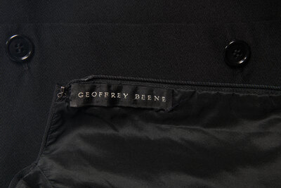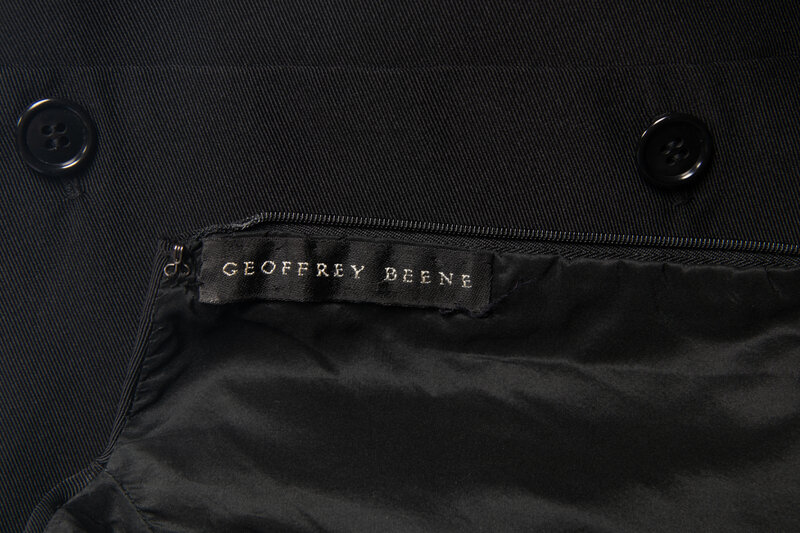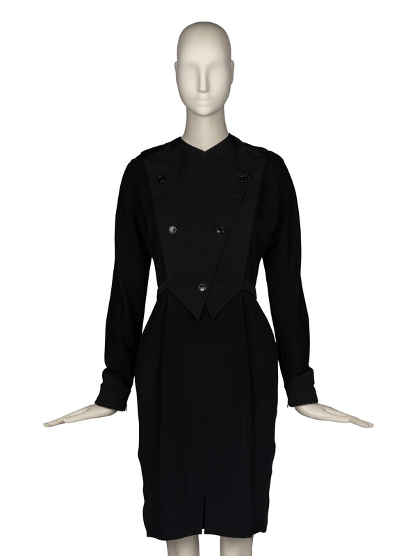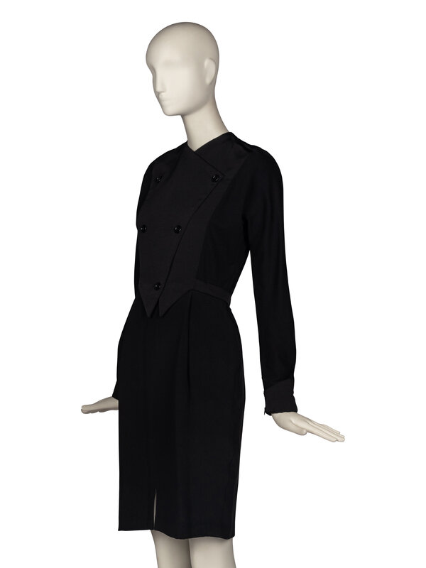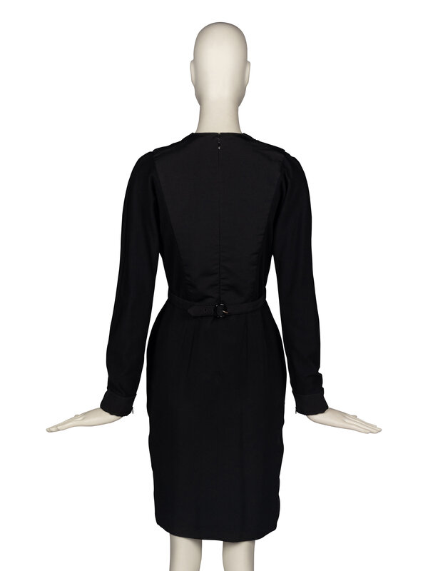Navy long-sleeve mid-length dress in mixed materials, including woven wool and faille. Double-breasted effect with ornamental buttons. Dolman sleeve. Attached, adjustable belt. Zip, hook-and-eye closures at back. Additional zippers at sleeves.