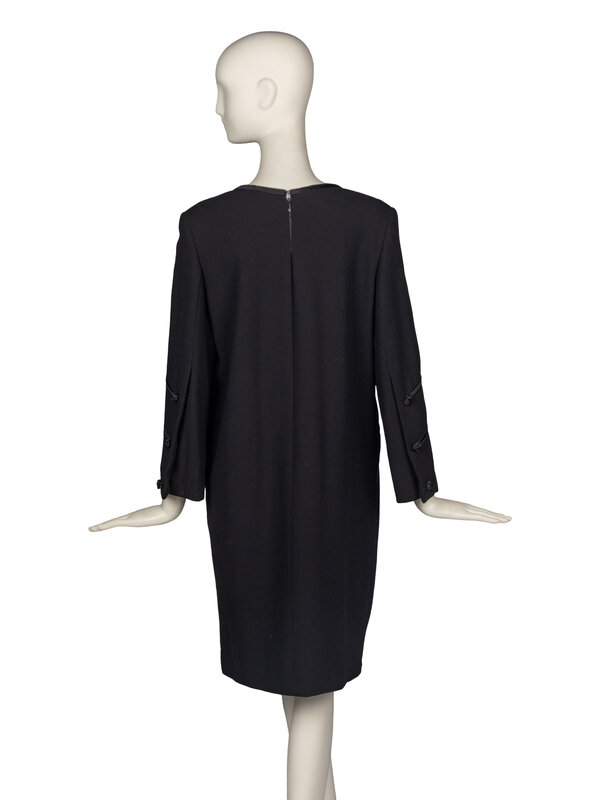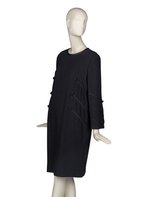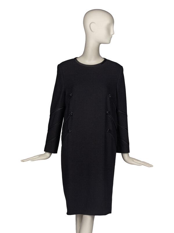 Straight shift dress in black wool crepe. Black satin ball knot and bound diagonal slit details at sides, coordinating details at sleeves. Zipper closure at back. Fully lined in silk.