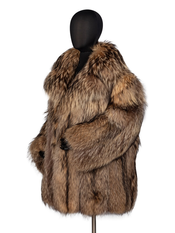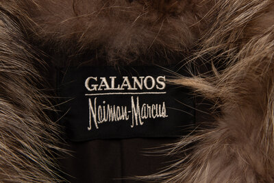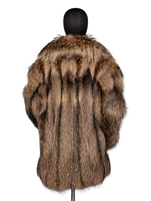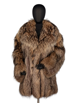 Stroller-length fur coat in Smokey Fox Fur. Oversize notch lapel collar and wide sleeves. Hidden in-seam pockets at waist side seams. 2 button & elastic loop closures at center front. Fully lined.