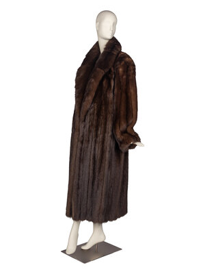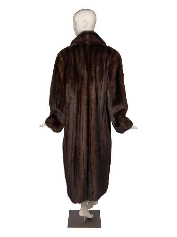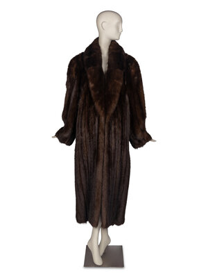 Full-length fur coat in dark brown sable. Full length sleeves. Notch lapel collar. Hidden in-seam pockets at hips. No closures. Fully lined.