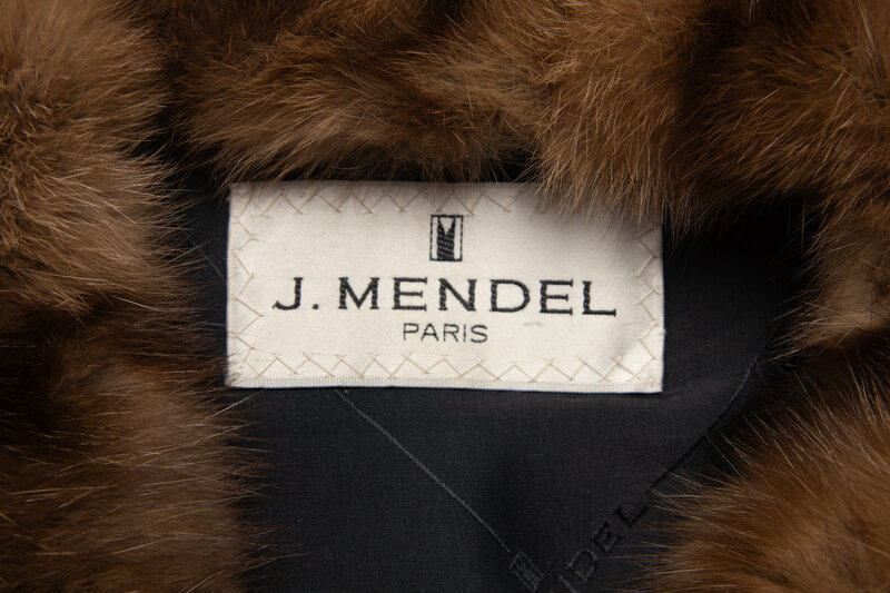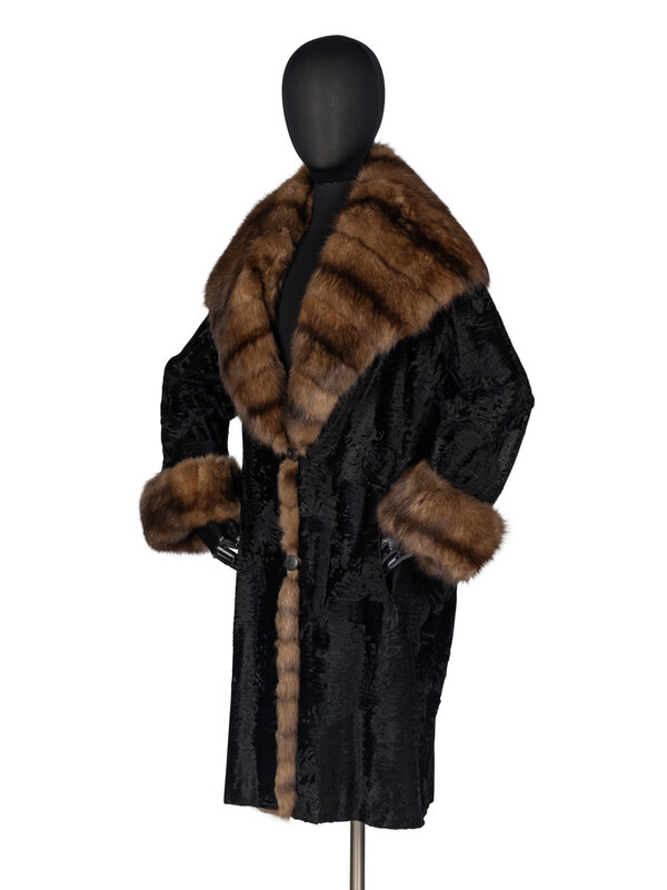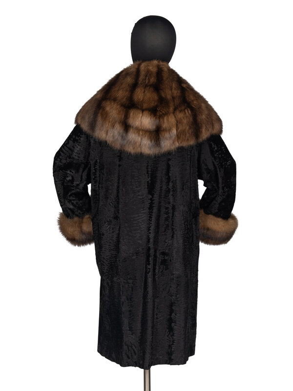 Black broadtail lamb fur coat trimmed with Barguzinsky Russian sable. Exaggerated shawl collar, rolled cuffs, two-button front closure, two pockets, jacquard lining.