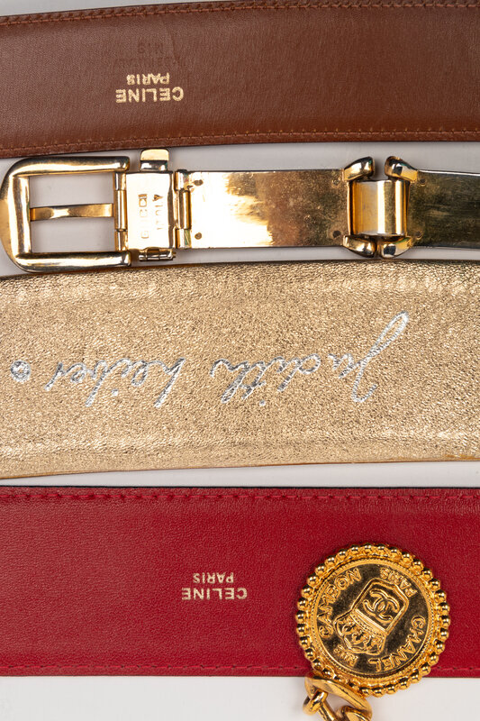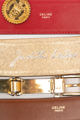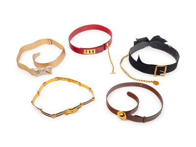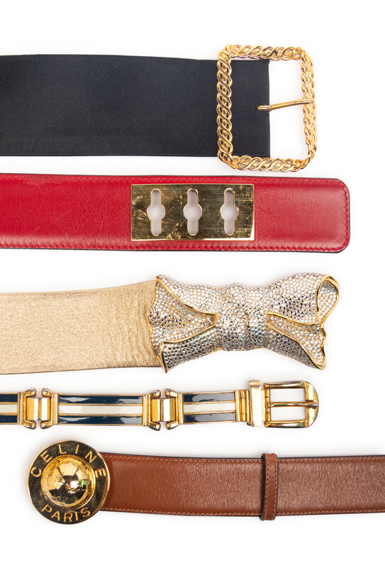 A Group of Five Designer Belts by Judith Leiber, Celine, Chanel, and Gucci