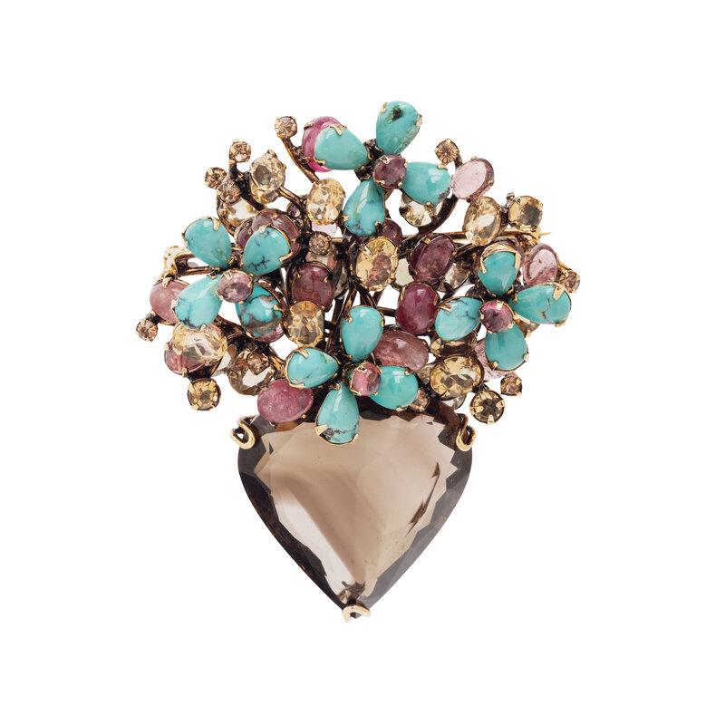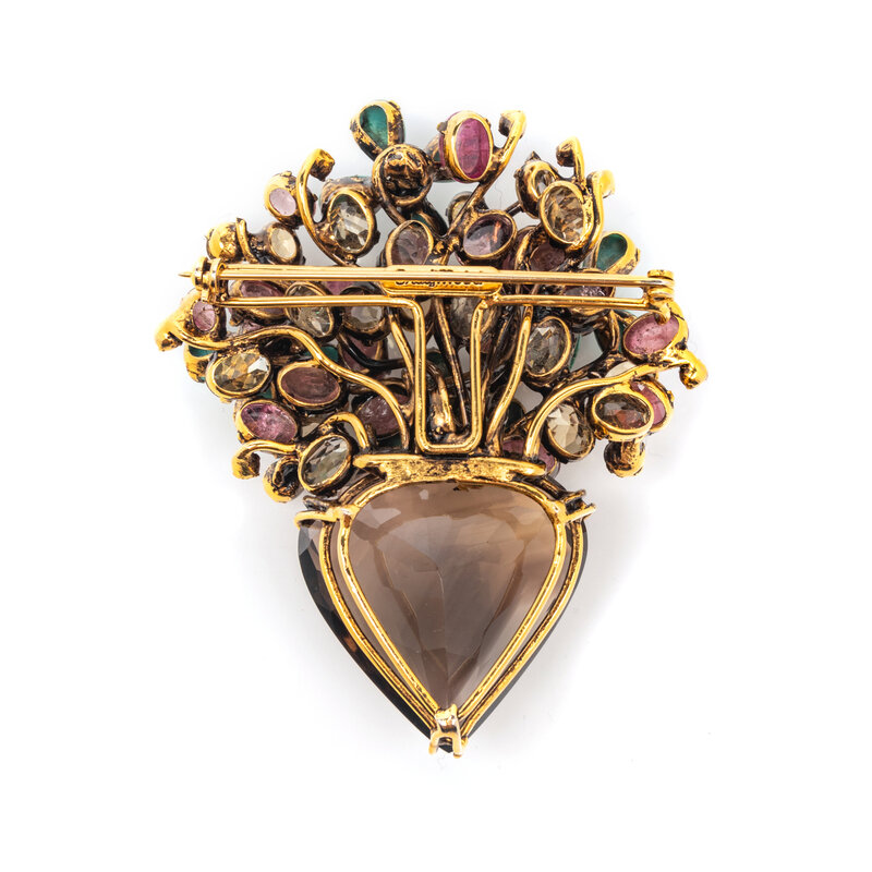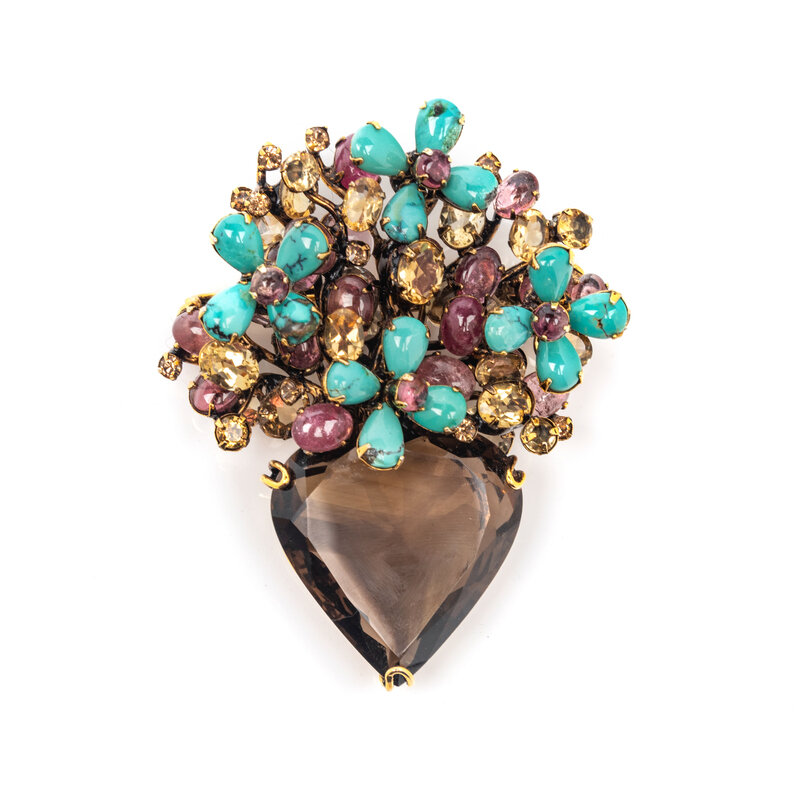 Containing pear shape cabochon turquoise, round and oval cabochon pink tourmaline, oval and round faceted citrine, and a pear faceted smoky quartz measuring approximately 35.30 x 34.40 mm. Yellow metal. 3 x 2 1/2 inches.