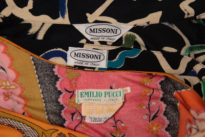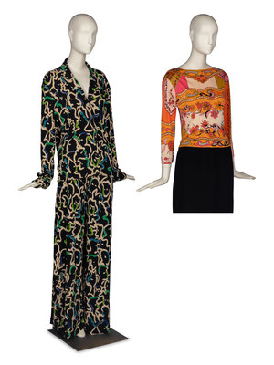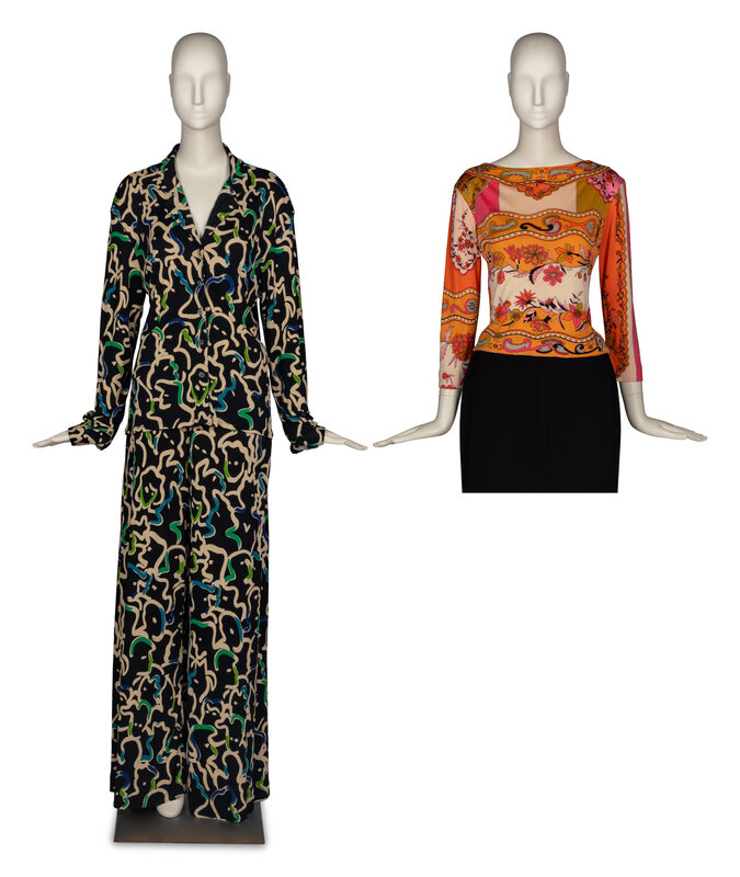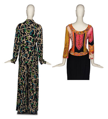Blouse in multicolor geometric floral print silk knit. 3/4-length sleeves. Boat neckline, deeper in back. Sewn panel around neckline. Unlined.