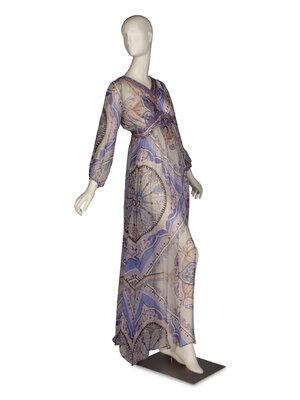 Full length semi-sheer dress in all-over multicolor print silk chiffon. V-neckline, long raglan sleeves. Rhinestone and beading embellishments around neckline and waist. Invisible zipper closure at side waist. Partially lined.