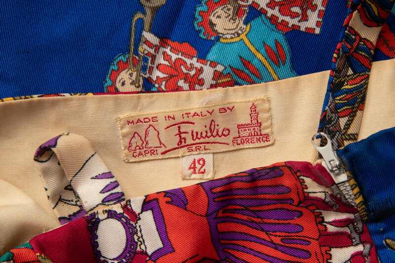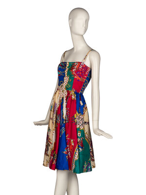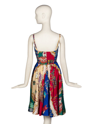 Knee-length fit-and-flare dress in multicolor printed silk twill. Medieval-themed illustrated print. Thin straps, squared neckline. Bias-cut circle skirt. Gathers at waist. Zipper closure at side bodice/waist. Partially lined.