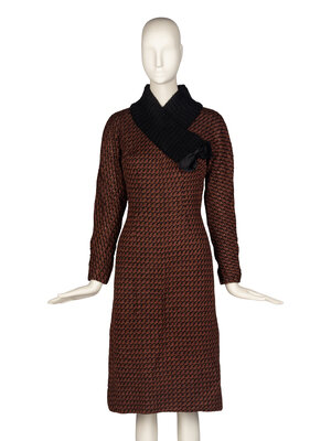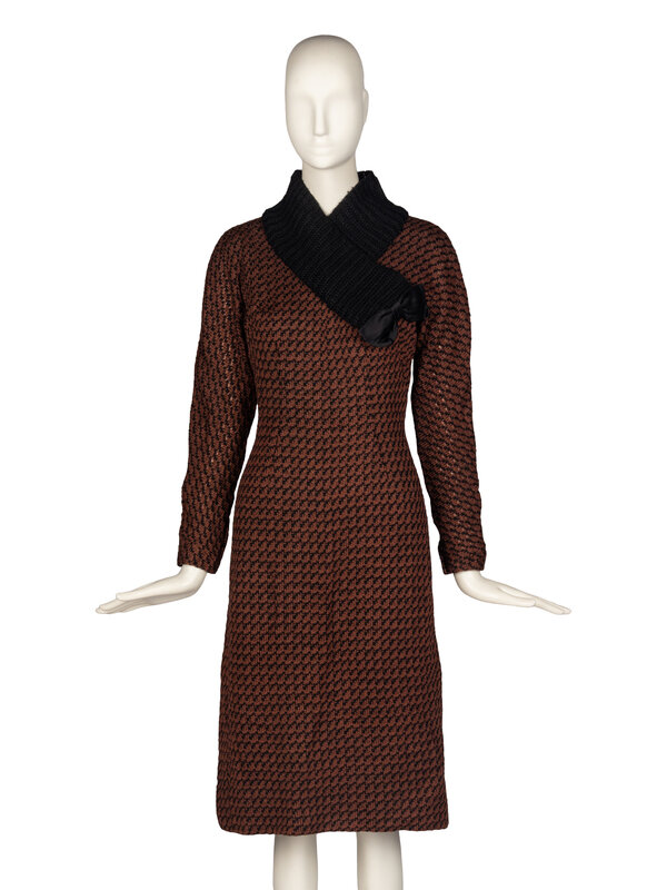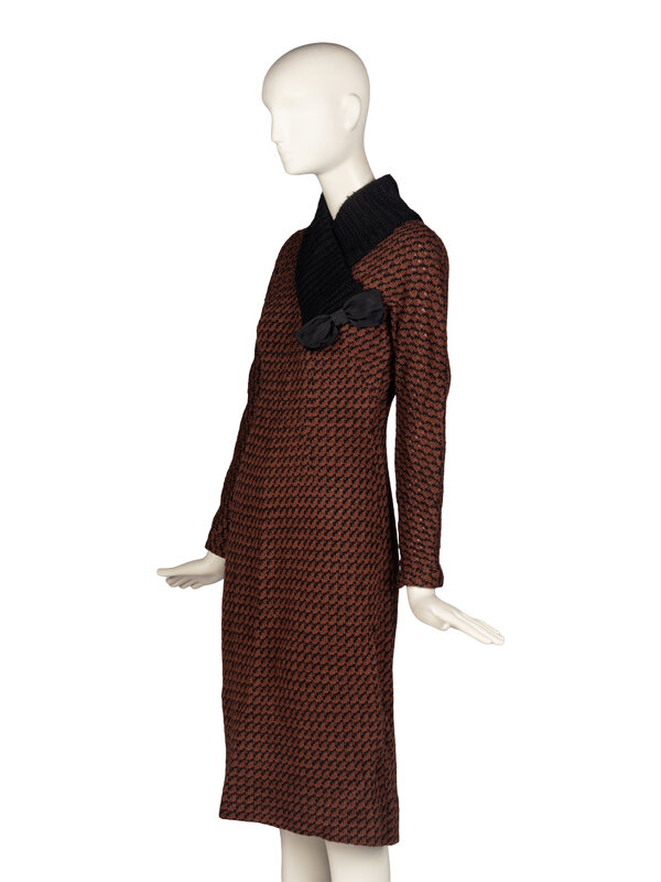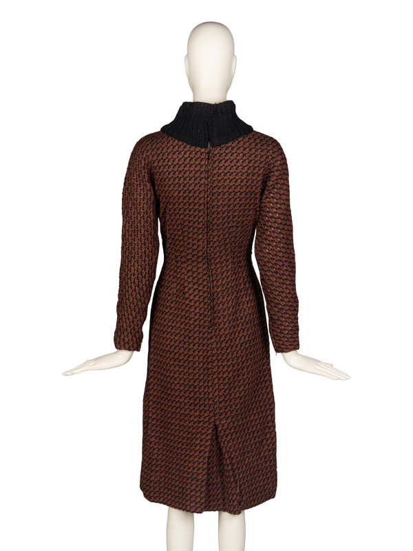 Tailored sweater dress in brown & black wool knit. Knee-length, long sleeve. High collar in black wool rib knit, extends onto chest with black satin bow at bust. Zipper closure at back with hook-and-eyes, zipper closures at wrists. Grosgrain waistband with hook-and-eyes at interior. Fully lined.