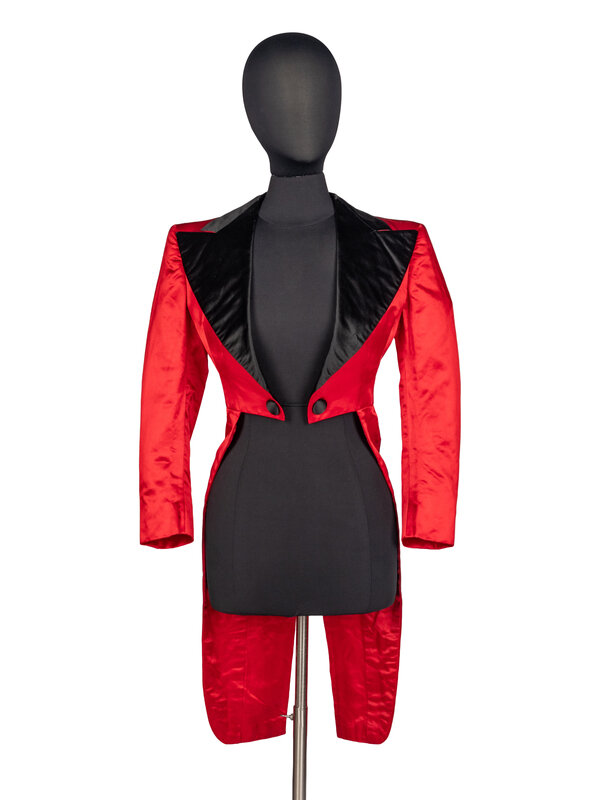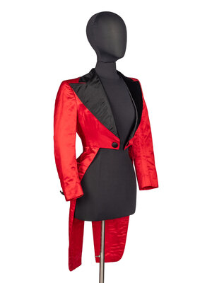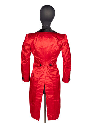 Red and black silk-satin tailcoat. Ornamental buttons Worn by Mickey Rooney in the film Babes in Arms (1939) in his role as Mickey Moran opposite Judy Garland. Labeled "Mickey Rooney 1088-5937."