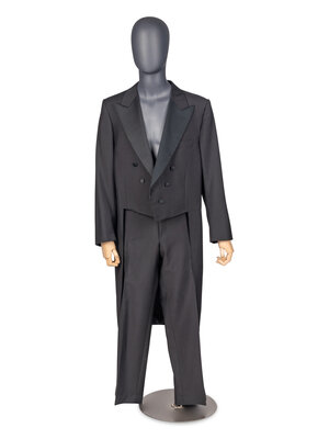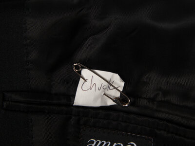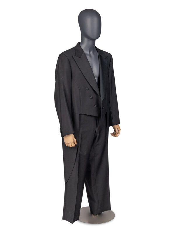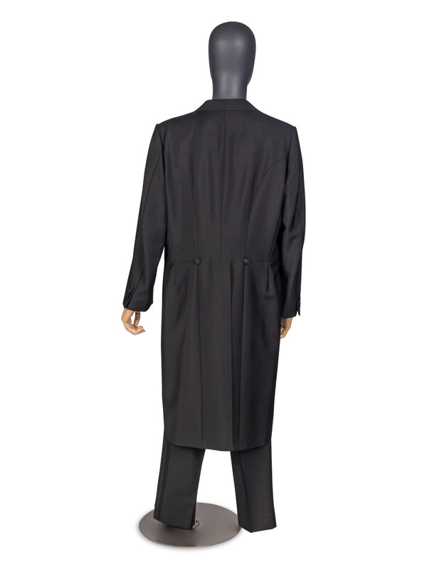Peaked-lapel tuxedo tailcoat with shoulder pads. Black wool-mohair blend. A small paper label reading "Chuck" has been pinned to the left interior breast pocket.