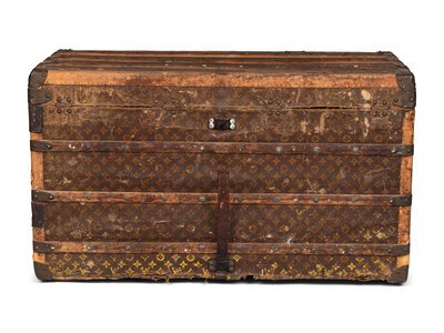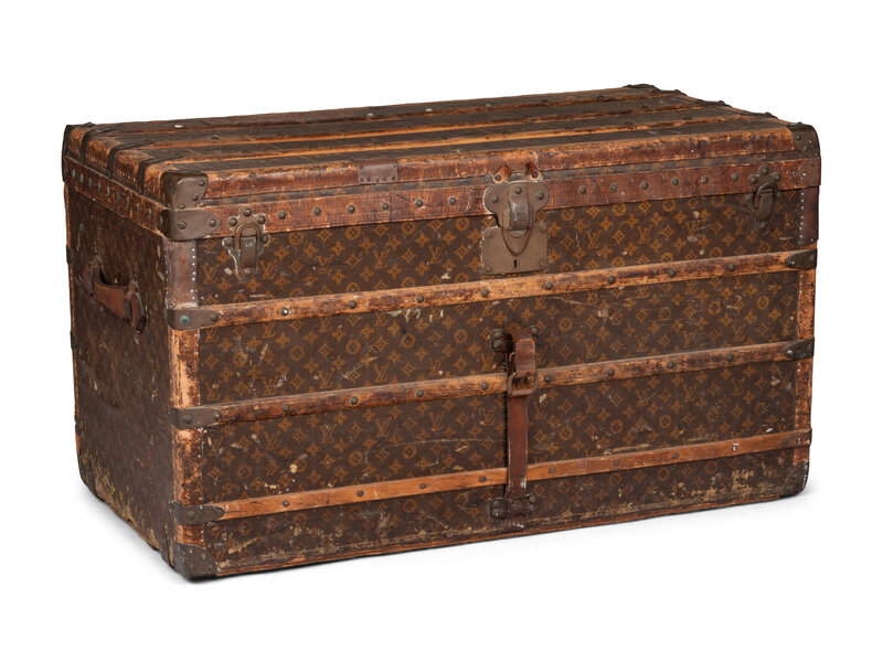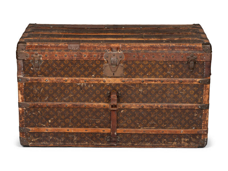 External details: Front brass three latch closures, stained wood slats rivetted to each side, black painted metal edging and brass endcaps, and bottom metal wheels