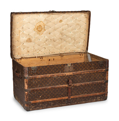 Interior details: White polished linen canvas lined padded and quilted lid with white tape and brass tacks