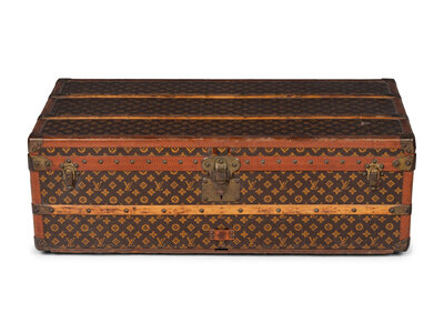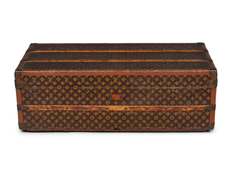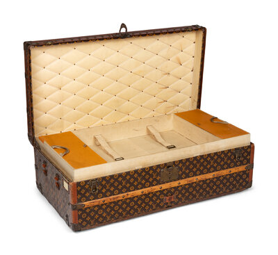 Additions: One large canvas lined tray with jacquard ribbon Louis Vuitton straps; with three compartments including two lidded dividable compartments