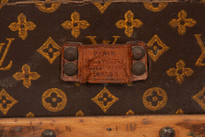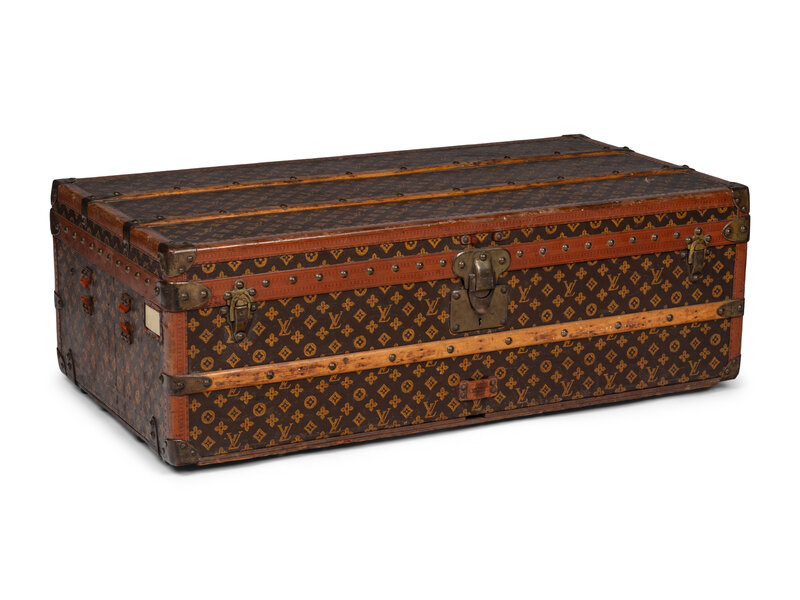 External details: Front brass three latch closures, stained wood slats rivetted to each side, brass metal brackets and corner caps, and bottom metal wheels