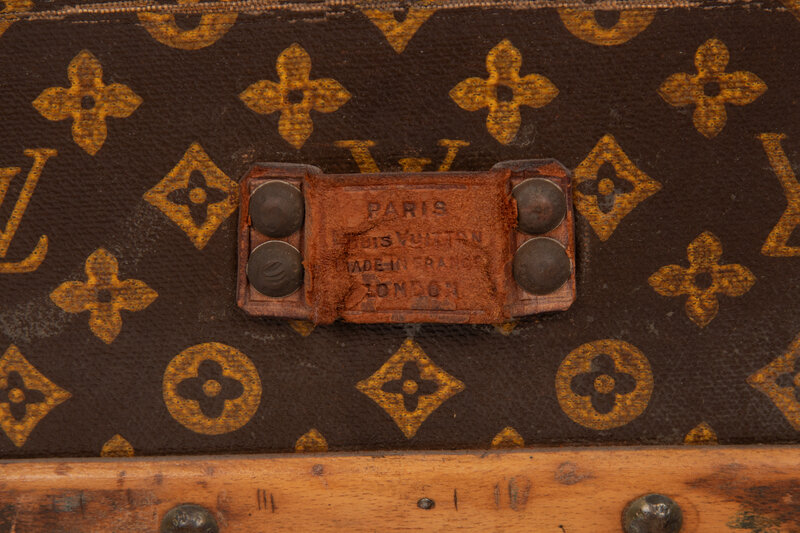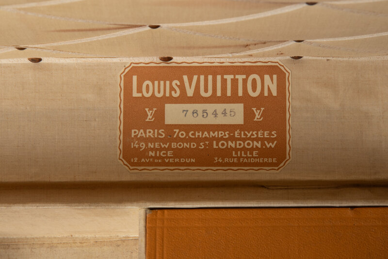 Interior details: White polished linen canvas lined padded and quilted lid with white tape and brass tacks, built-in shelving brackets for removable tray