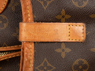 Additional Information: Gold-tone hardware, vachetta leather handle at top, metal hanger at top, opening with buckling strap closure at bottom, vertical zipper closure at center front, horizontal zipper closure at back bottom quarter, brown textile lining.