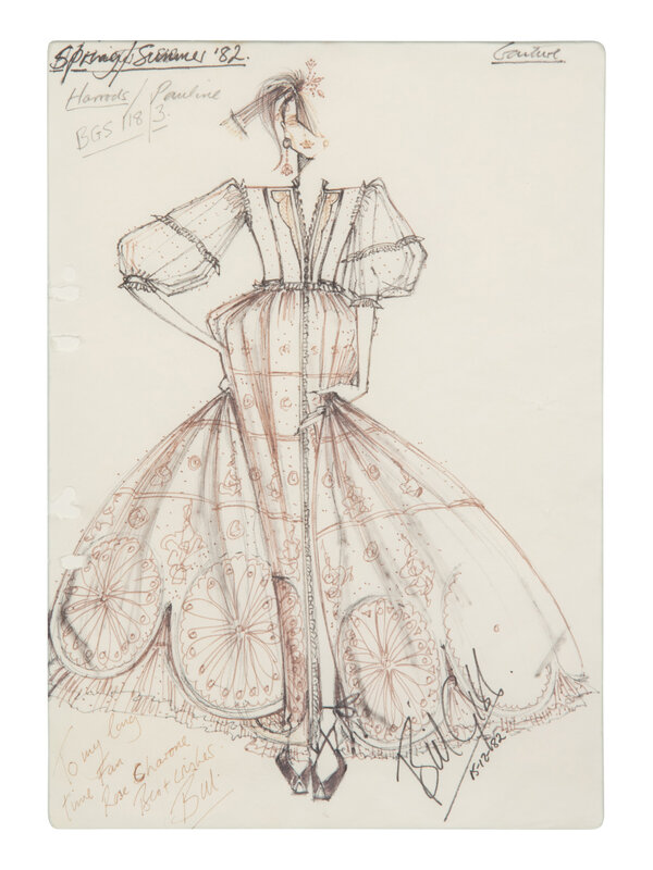 A framed fashion illustration by Scottish designer Bill Gibb (1943-1988). Inscribed 'To my long time fan Rose Charone, Best wishes. Bill.'