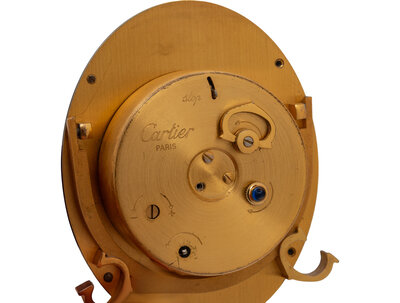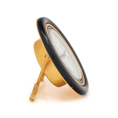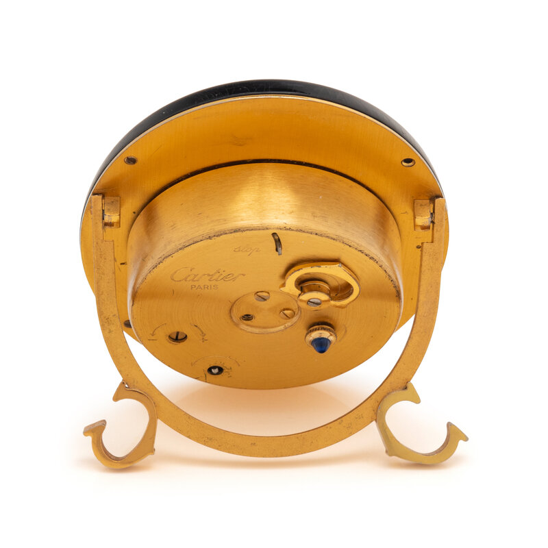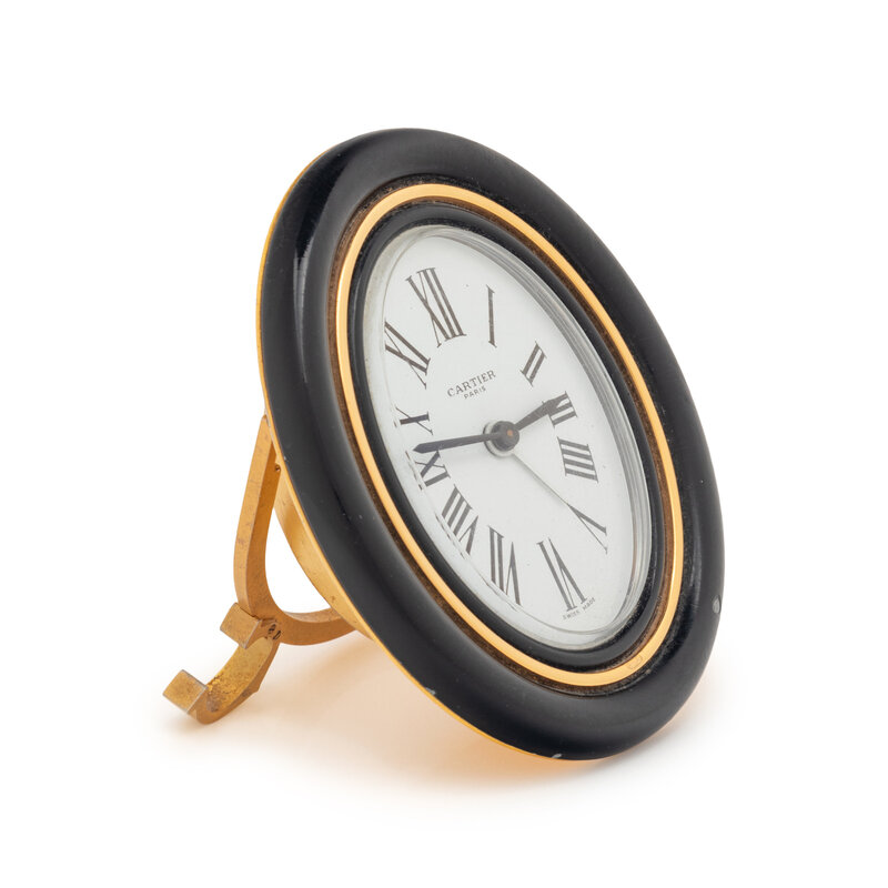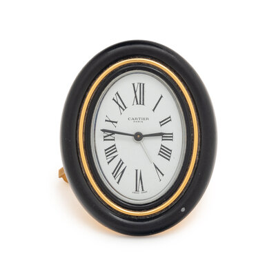 A Cartier Bedside Clock of oval form, the dial having Roman numeral hours; signed Cartier. Black lacquered frame with inset gold-tone metal hoop. Backing is gold-tone metal.