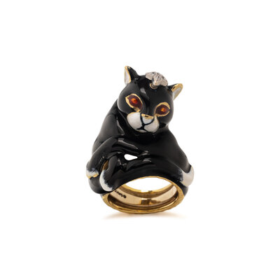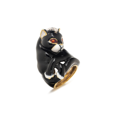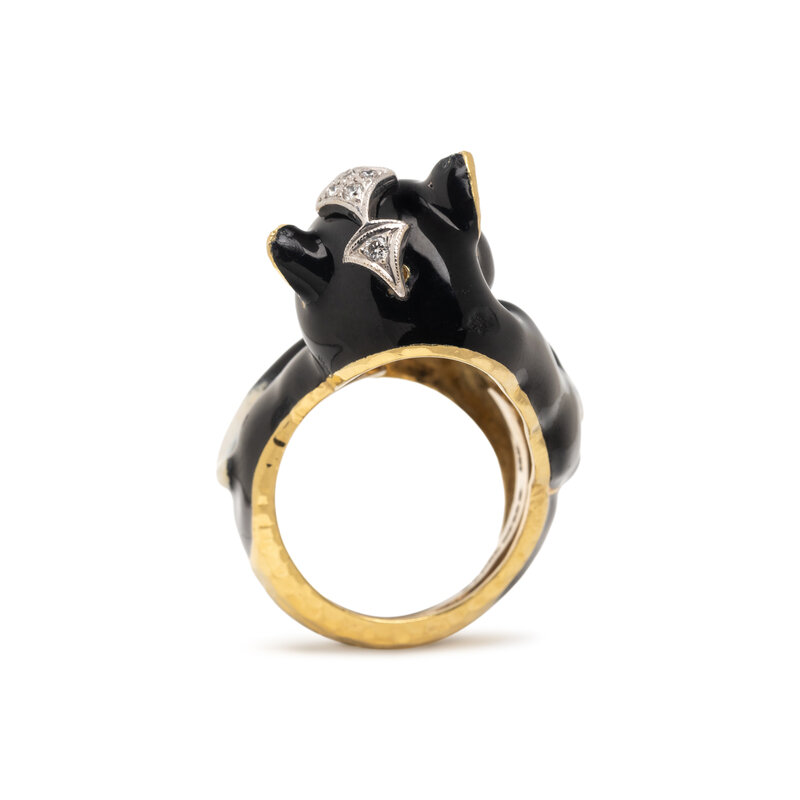 DAVID WEBB, YELLOW GOLD, DIAMOND, AND ENAMEL CAT RING