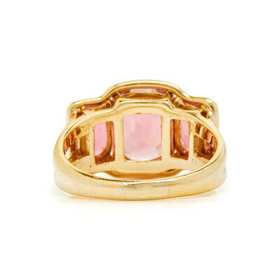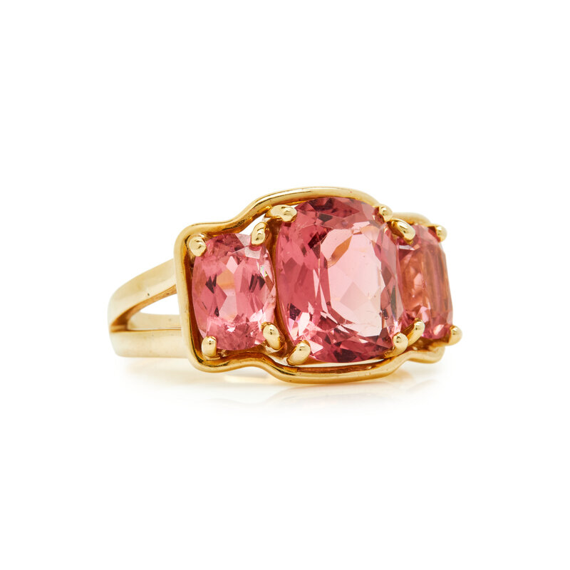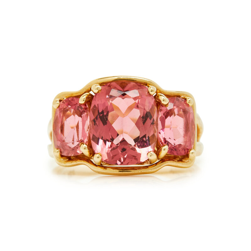 Cushion cut pink tourmaline measuring approximately 10.00 x 8.10 x 5.35 mm and oval cut pink tourmalines measuring approximately 7.00 x 5.00 mm. 18 karat yellow gold. Ring size 6.