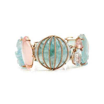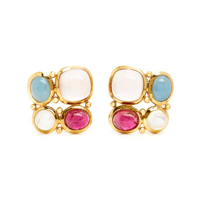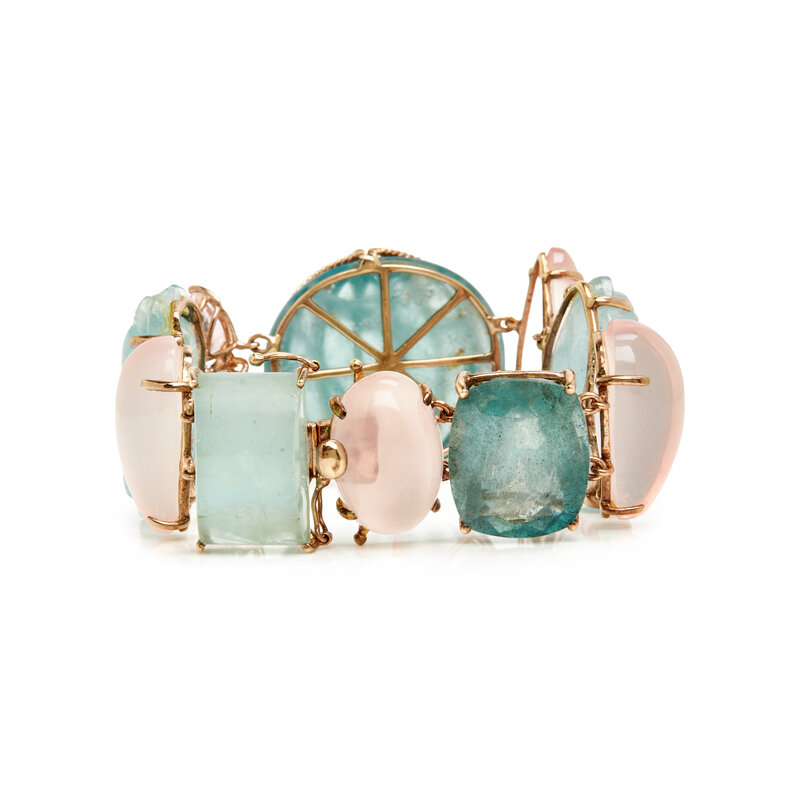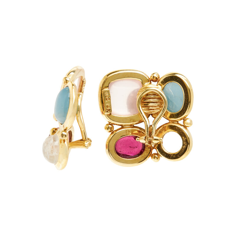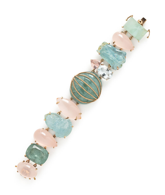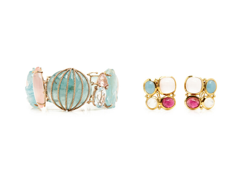 Clip earrings set with cabochon tourmaline, moonstone and chalcedony, together with a bracelet set with variously shaped quartz, beryl and round brilliant cut diamonds. 14 karat and 18 karat yellow gold. Earrings: 1 x 1 inch. Bracelet: 7 1/2 inches long, 1 1/4 inches wide.