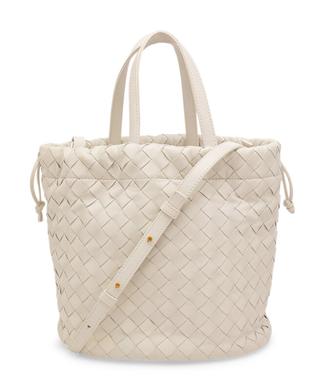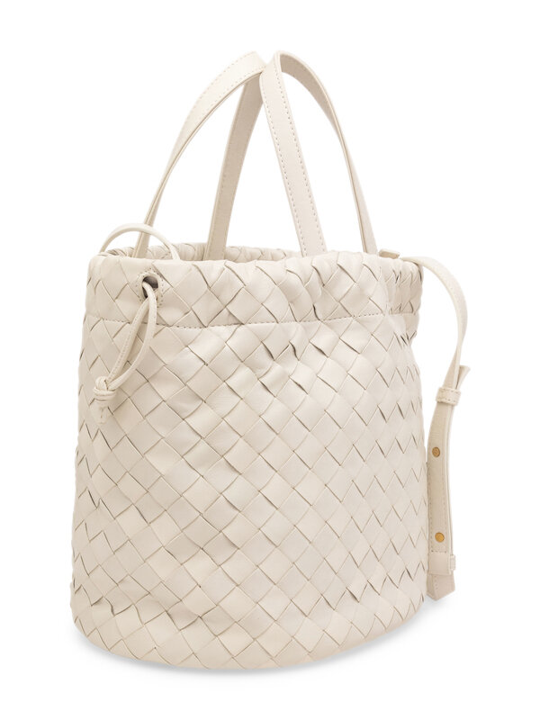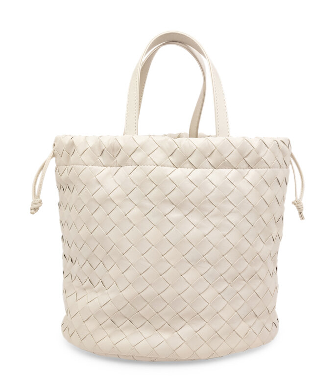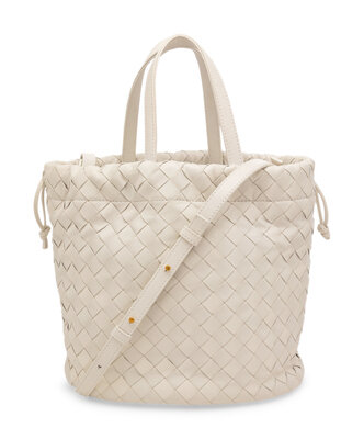 Castello Leather Bucket Bag in White Intrecciato Leather with Gold-Tone Hardware.