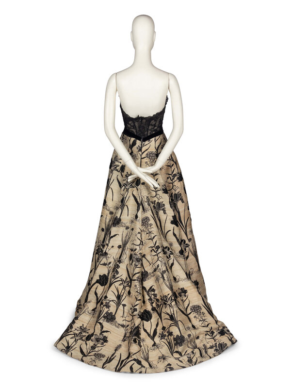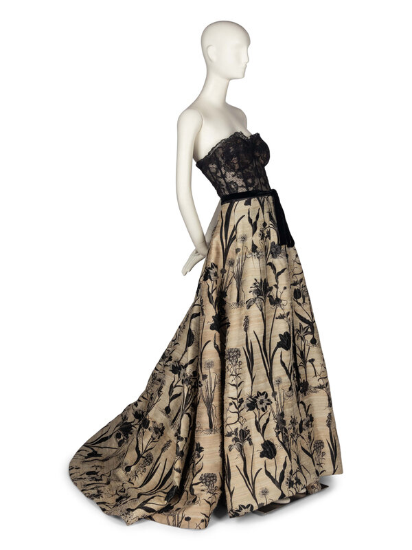 Strapless, full-skirted gown with black lace bustier bodice. Black velvet ribbon tie at waist. Tan raw-silk skirt with black intarsia floral motifs. Bodice is partially sheer; opaque built-in bra with padding. Boning within bodice and structural reinforcement at hemline. Look 34 from the Fall/Winter 2018 collection.