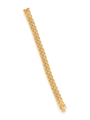 Woven design measuring approximately 12.00 mm wide, with integrated clasp. 18 karat yellow gold. 7 inches long.