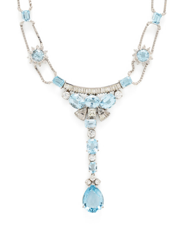 Pear mixed cut, round brilliant cut, oval mixed cut, and emerald cut blue topaz, and princess cut, round brilliant cut, trillion cut, and baguette cut diamonds weighing approximately 10.00 carats total. 14 karat white gold. Necklace: 15 inches long. Pendant: 3 1/2 inches long.