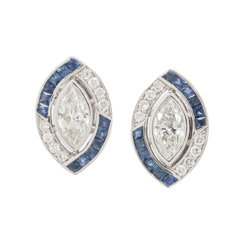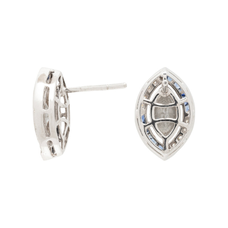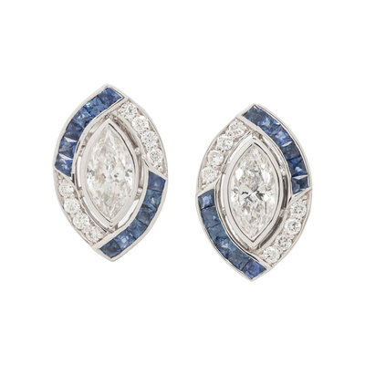 Marquise cut and round brilliant cut diamonds weighing approximately 1.35 carats total, and French cut sapphires. 18 karat white gold. 5/8 inch long.