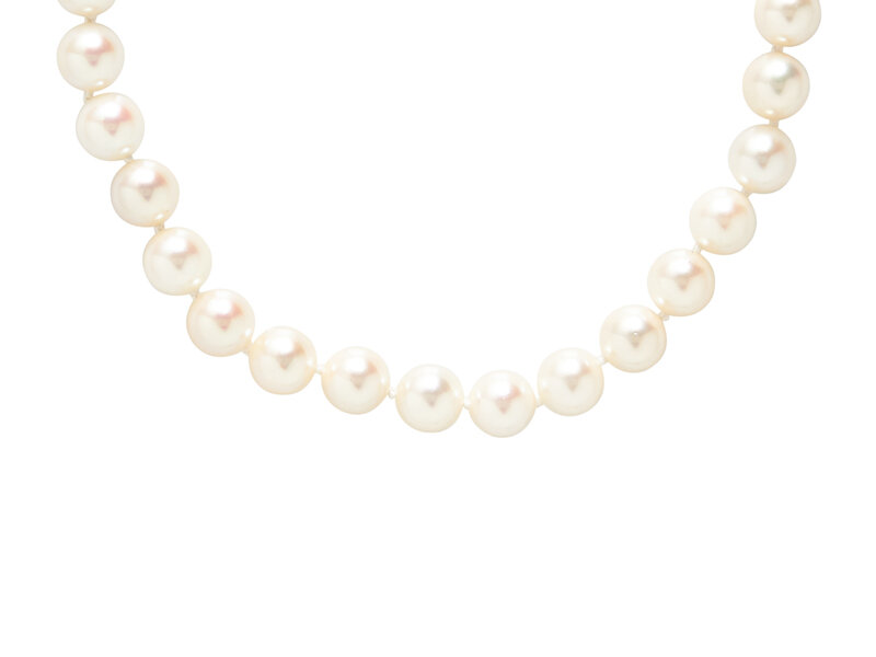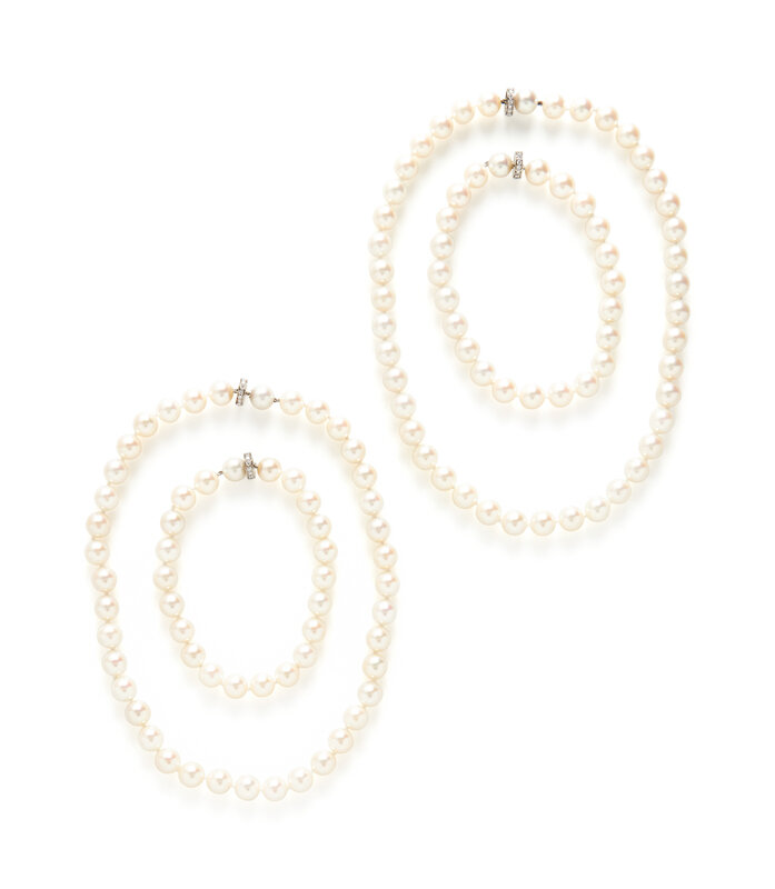 Four convertible strands of string-knotted cultured pearls measuring approximately 8.40-8.85 mm, with round brilliant cut diamond accents. White gold. 8 1/4, 9 , 15, and 16 inches long.