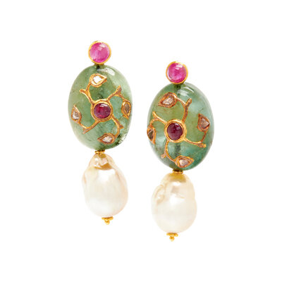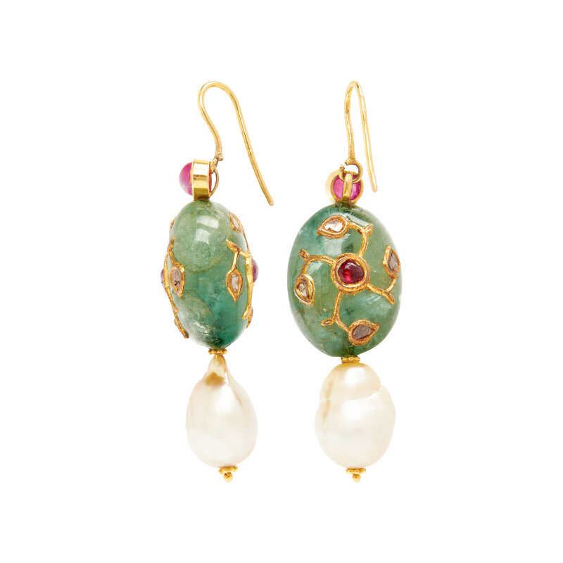 Tumbled emerald beads measuring approximately 22.50 x 17.30 x 12.25 mm, cultured baroque pearls measuring approximately 10.00-12.00 mm, round cabochon rubies and polki diamonds. Yellow gold. 2 1/4 inches long.
