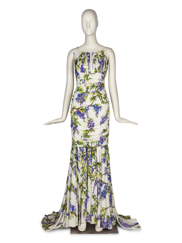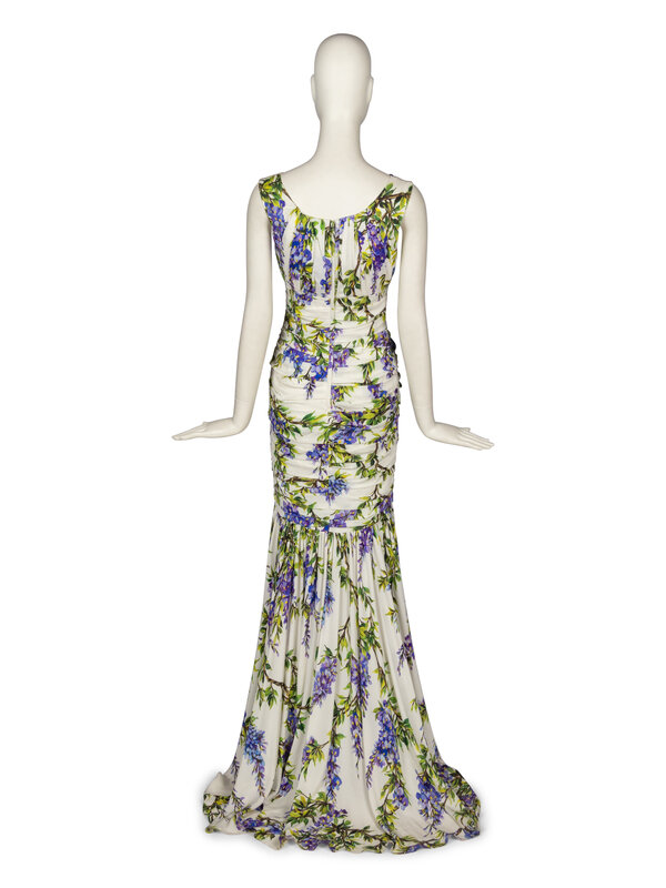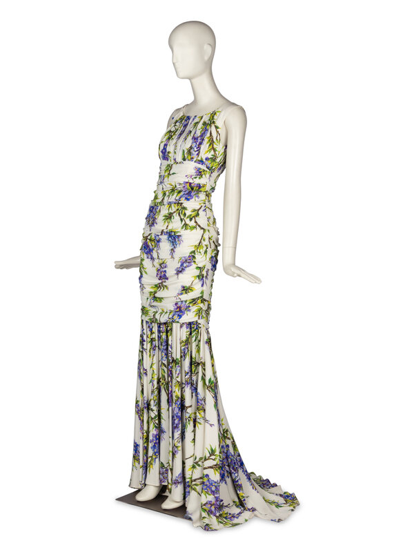 Ruched gown in wisteria-printed silk blend with train. Sleeveless with round neckline. Rear zip closure. Partially lined.