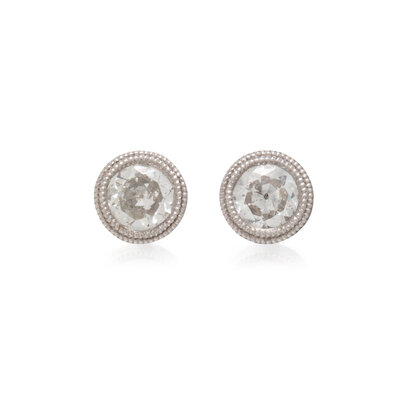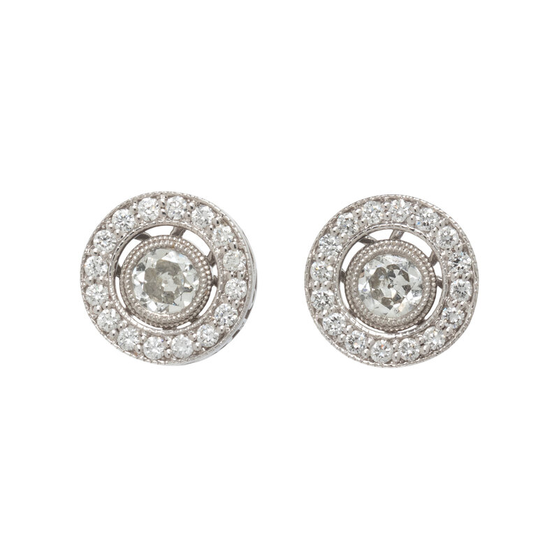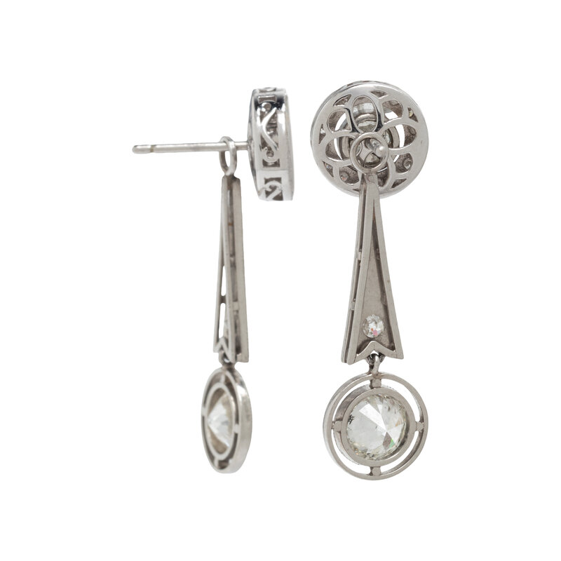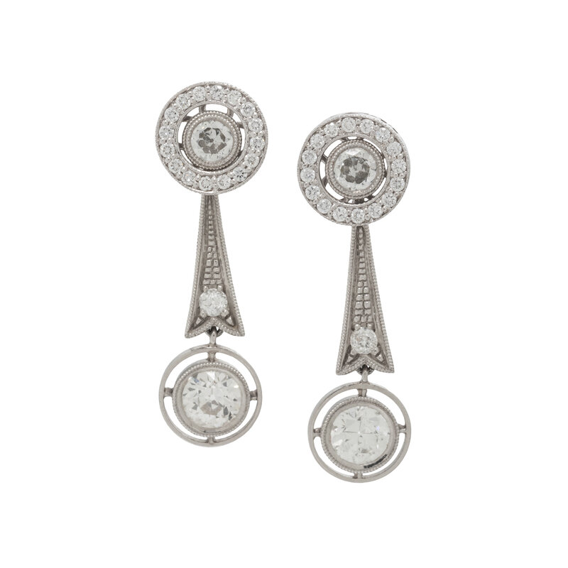 Stud earrings set with transitional cut diamonds weighing approximately 0.43 carat total, earring jackets containing a halo of round brilliant cut diamonds weighing approximately 0.19 carat total, and dangling earring jackets containing old European cut and transitional cut diamonds weighing approximately 1.10 carat total. Platinum and white gold. 1 1/4 inches long.