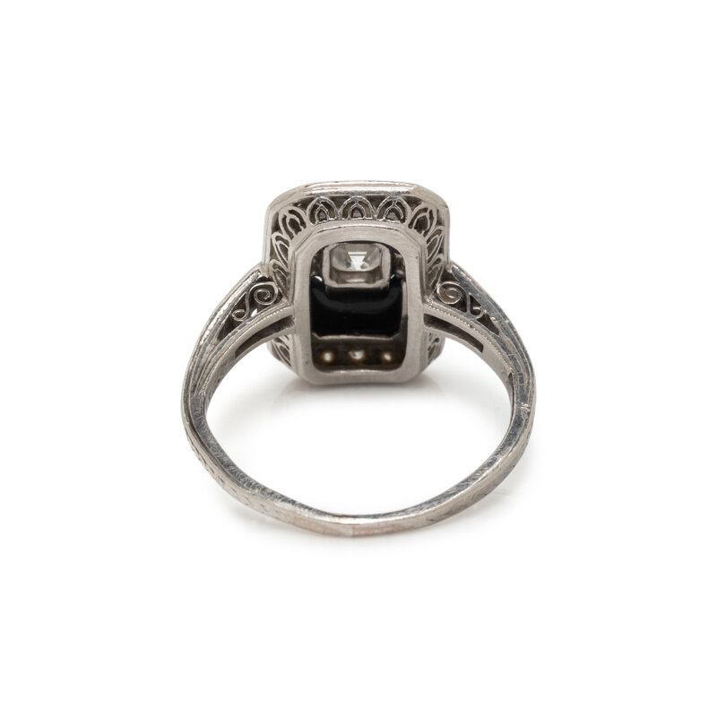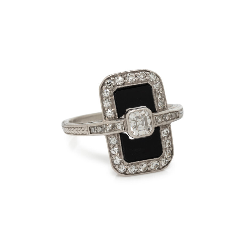 Black onyx and single, French, and emerald cut diamonds weighing approximately 0.60 carat total. Platinum. Ring size 5.
