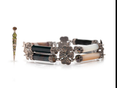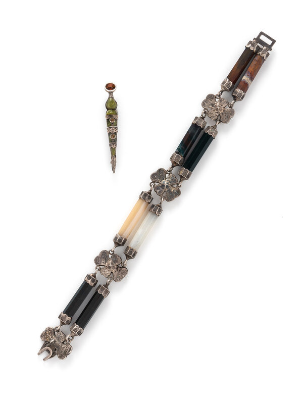 Including a brooch set with green agate and round faceted quartz measuring approximately 2.80 - 5.70 mm, and a bracelet set with geometric agate measuring approximately 30.50 x 7.00 mm. Silver. Brooch: 2 1/4 inches long. Bracelet: 9 1/2 inches long.