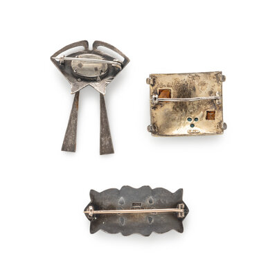 Consisting of three brooches, set with citrine and turquoise, blue glass, and polychrome enamel. 1 1/4 x 1 inch, 1 3/4 x 1 1/4 inches, and 1 1/2 x 1 inch.
