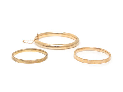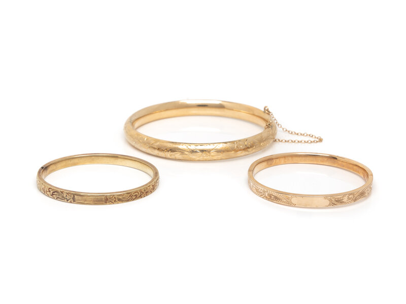 All hinged with side clasp. 14 karat yellow gold. 5 inches, 5 1/4 inches, and 7 inches inner circumference.