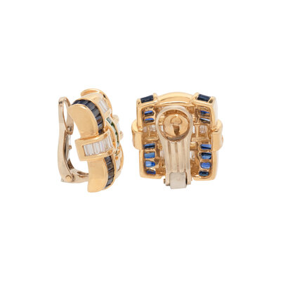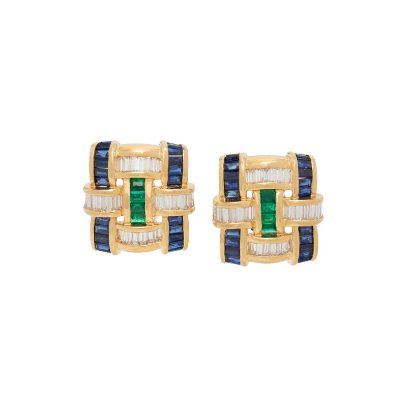 CHARLES KRYPELL, DIAMOND, SAPPHIRE, AND EMERALD CLIP EARRINGS