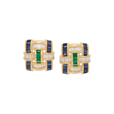 Baguette cut diamonds weighing approximately 1.80 carats total, and rectangular step cut sapphires and emeralds. 18 karat yellow gold. 3/4 inch long.