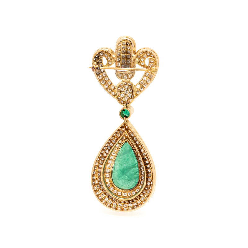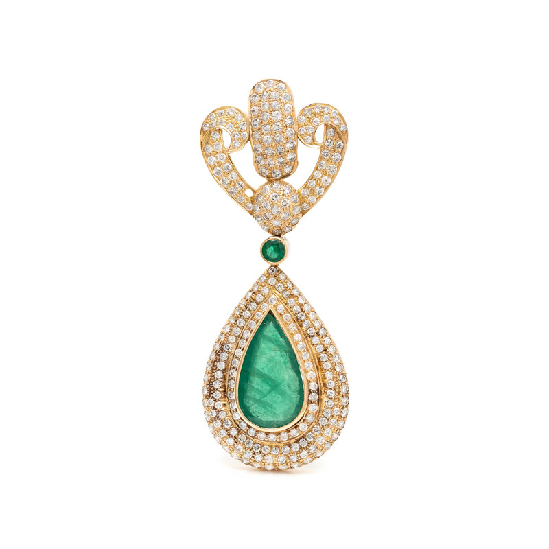 Round faceted synthetic emerald measuring approximately 4.23 mm, pear shaped synthetic emerald measuring approximately 20.80 x 11.90 x 5.82 mm, and round brilliant cut diamonds weighing approximately 3.00 carats total. Yellow gold. 2 3/4 x 1 1/16 inches.