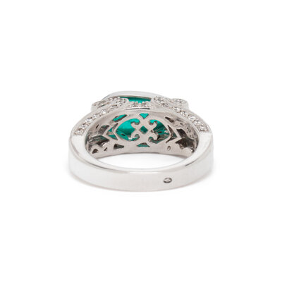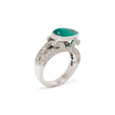 Pear shape cabochon emerald measuring approximately 13.00 x 6.12 mm and round brilliant cut diamonds. 18 karat white gold. Ring size 5 3/4.