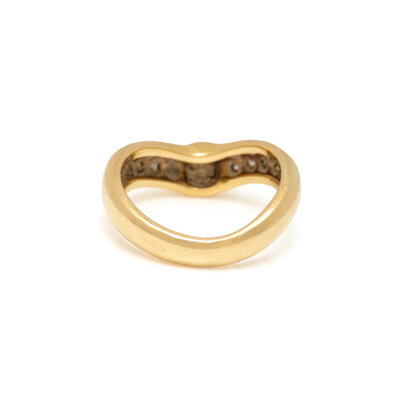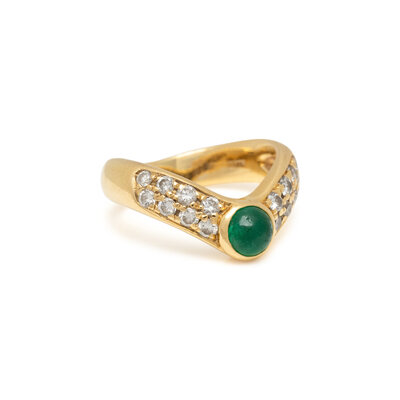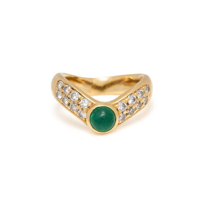 Round cabochon emerald measuring approximately 4.35 mm and round brilliant cut diamonds. Yellow gold. Ring size 3 3/4.