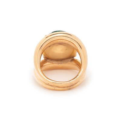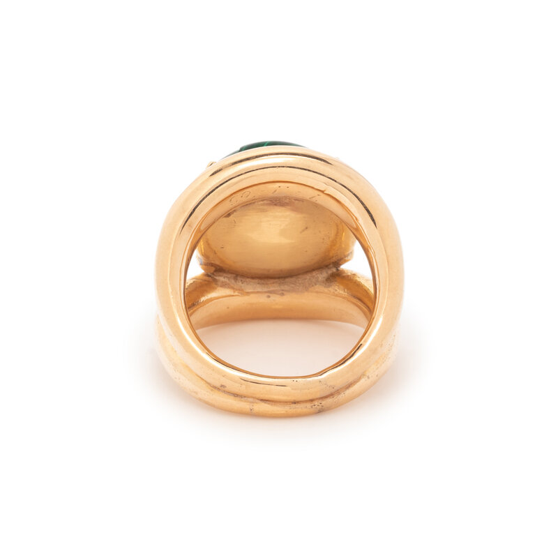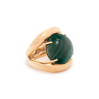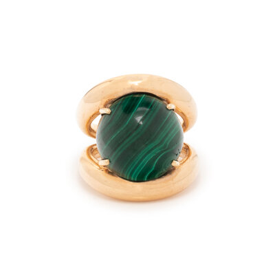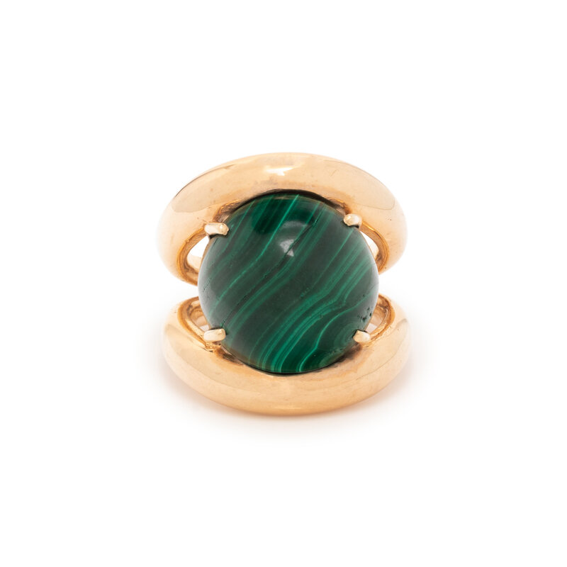Round cabochon malachite measuring approximately 16.50 mm. Yellow gold. Ring size 7.