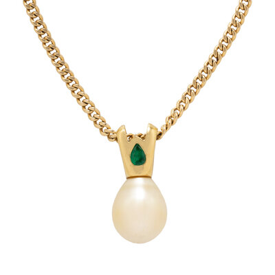 Cultured pearl measuring approximately 14.25 mm and one pear shaped emerald. Yellow gold. Pendant: 1 1/4 inches long. Chain: 18 inches long.