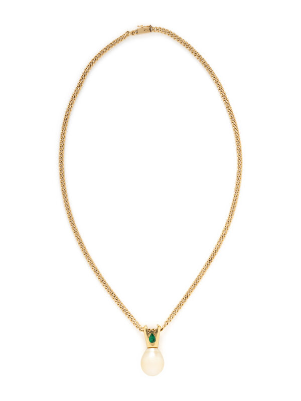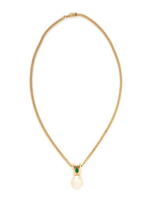 YELLOW GOLD, CULTURED PEARL, AND EMERALD NECKLACE