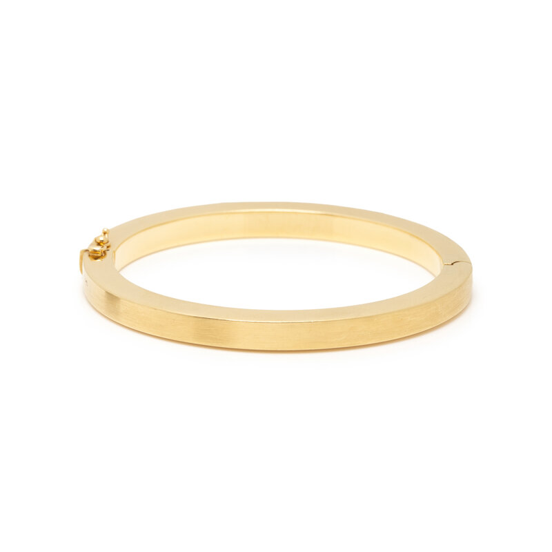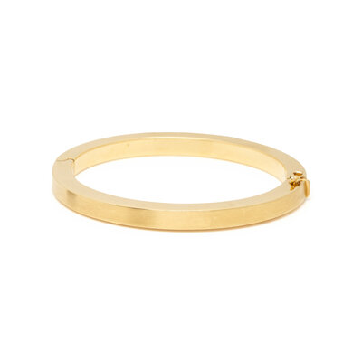 Hinged with side clasp. 18 karat yellow gold. 7 inches inner circumference.